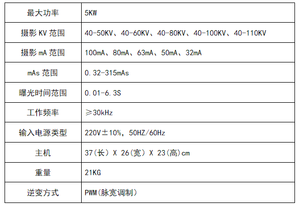 客户又采购了 台便携式医用X光机,这台设备的特点是采用高频逆变技术生产,稳定高压输出可获良好的影响质量,而且设计紧凑,便于携带在不同地区环境位置展开工作,具有三种曝光控制方式遥控式、手闸式和界面按键式,有灵活的数字接口,用户可以深入核心编程控制,可适配不同的DR探测器,以下是产品的技术参数。